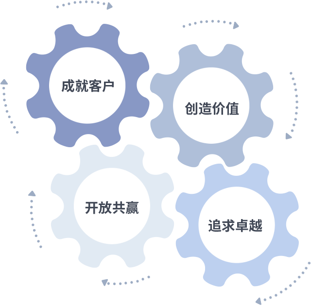 成就客户是一切决策的出发点,,,,创造价值是衡量所有工作的标准,,,,追求卓越是我们做事做人的态度,,,,开放共赢是我们的格局也是最终的结果。。。。价值观的齿轮环环相扣,,,推动着组织里的每个人不断向前。。